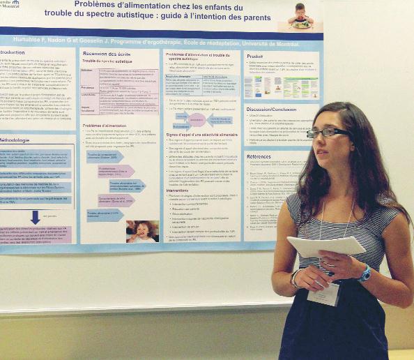 En tout, près d’une centaine d’étudiants ont livré, sous formes de présentations par affiches, de vidéos et de conférences, les résultats de leurs travaux sur des sujets très variés, permettant la mise en valeur des connaissances les plus récentes en ergothérapie. Transfert des connaissances, rééducation sensitive, conduite automobile, évaluations de tâches, troubles du sommeil, motricité, vision, stratégies d’apprentissage, parents, aides techniques, jeu, douleur chronique, travail, soutien à domicile, interventions psychosociales, voilà quelques un des nombreux sujets interpellant l’ergothérapeute et qui ont été abordés par les finissants.
